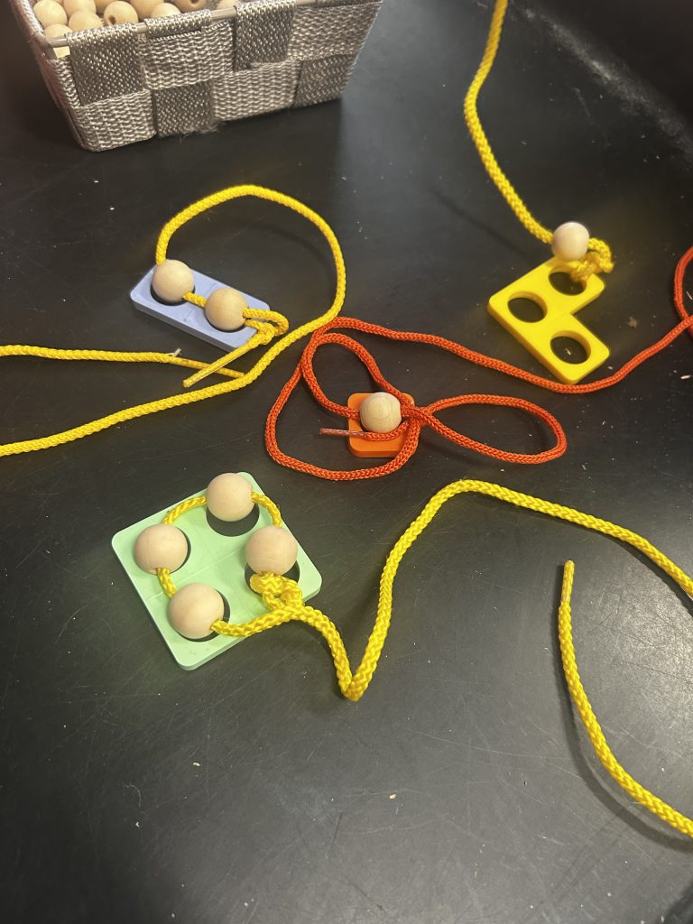 L’enfant choisit un numicon, compte le nombre de trous et doit accrocher le même nombre de perles sur la ficelle.