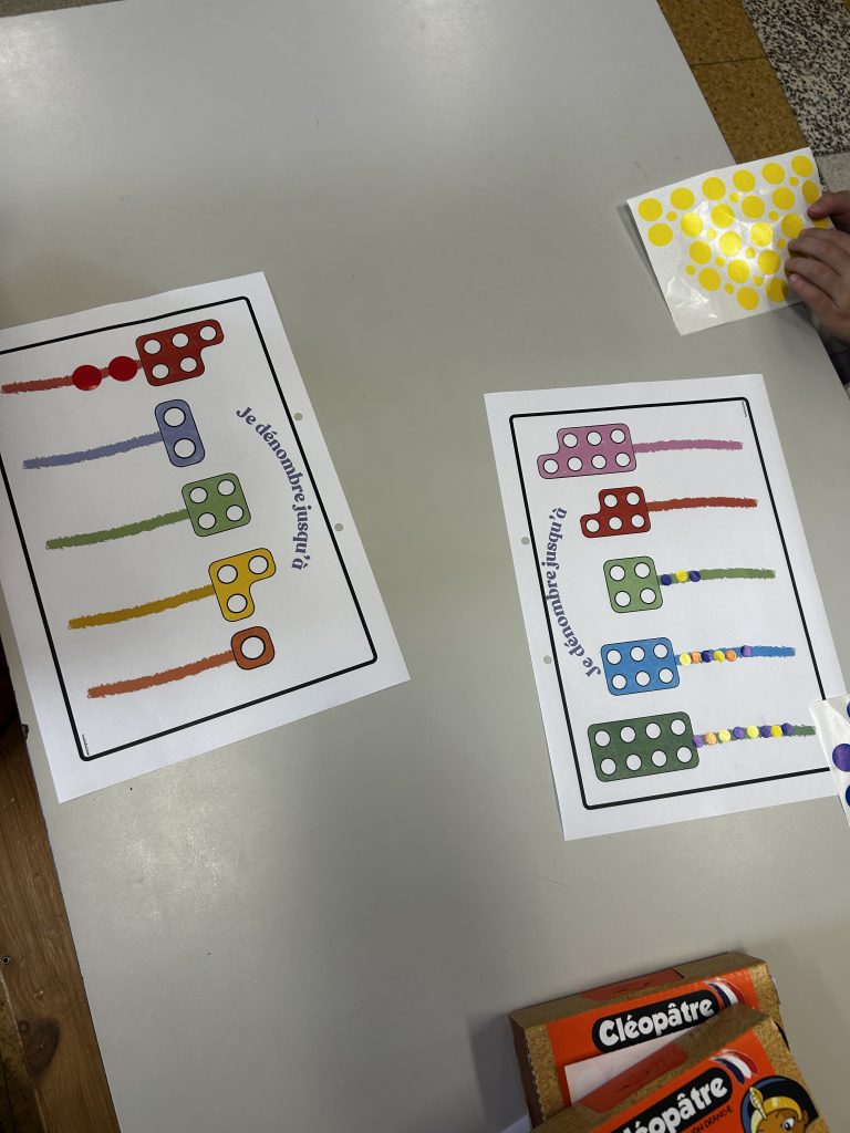 Une fois l’atelier terminé, les enfants ont laissé une trace sur feuille. J’avais préparé une fiche avec les différents numicons : les enfants devaient coller des gommettes sur la ficelle dessinée pour représenter le bon nombre.