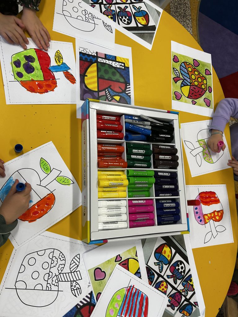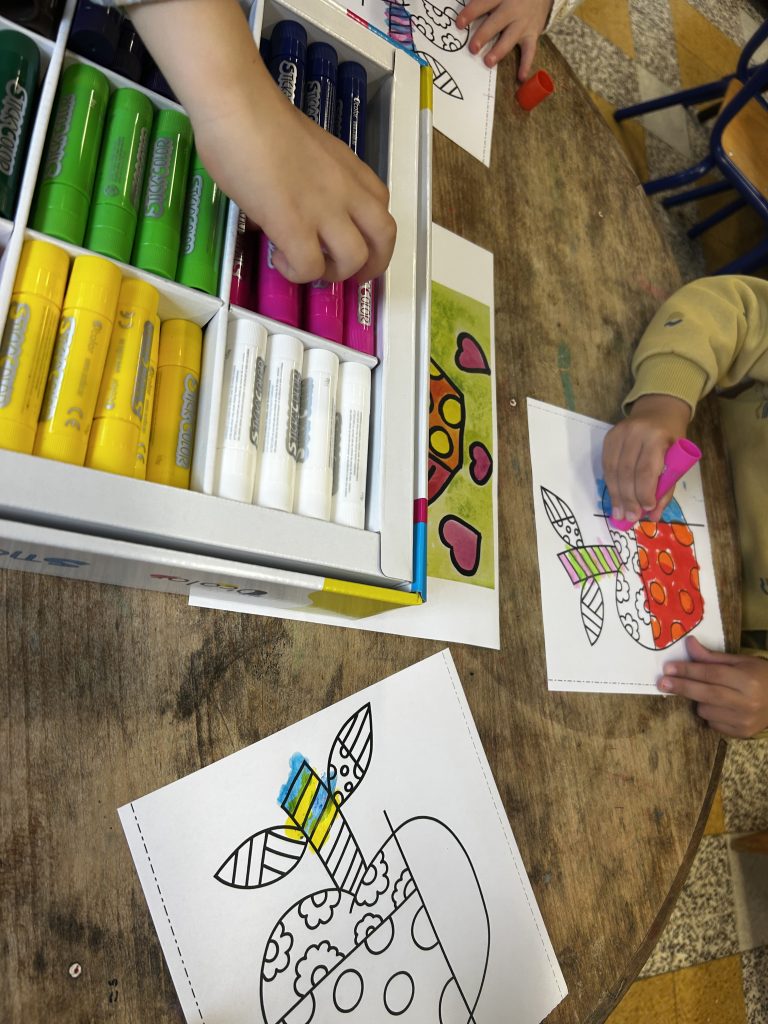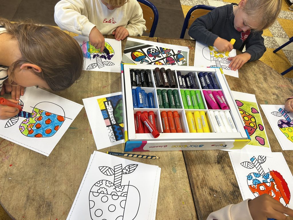 🧒 Les moyens ont colorié des pommes à l’aide de sticks de gouache, en s’inspirant du style plein de peps de Romero Brito.