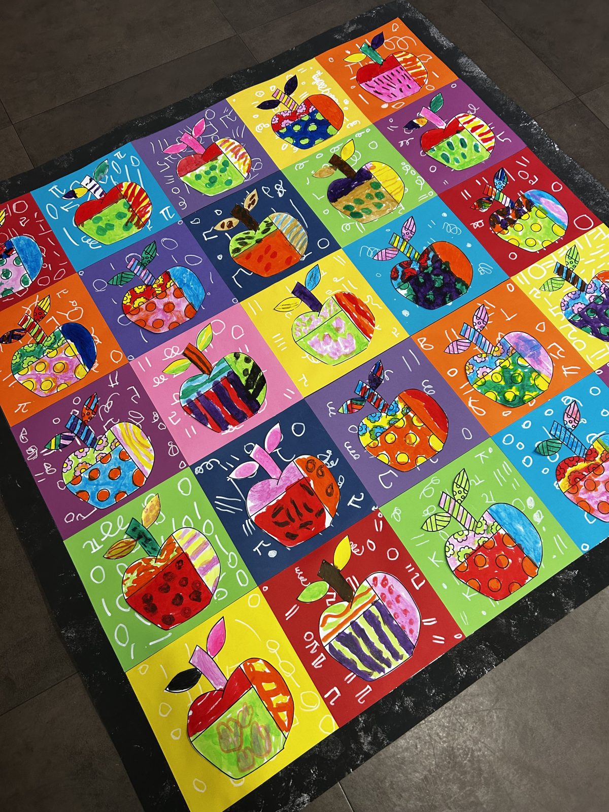 👧 Les grands ont, eux, créé leurs propres pommes, en inventant l’intérieur à la manière de Brito 🎨, puis ont ajouté des graphismes sur fonds colorés pour compléter l’ensemble.
