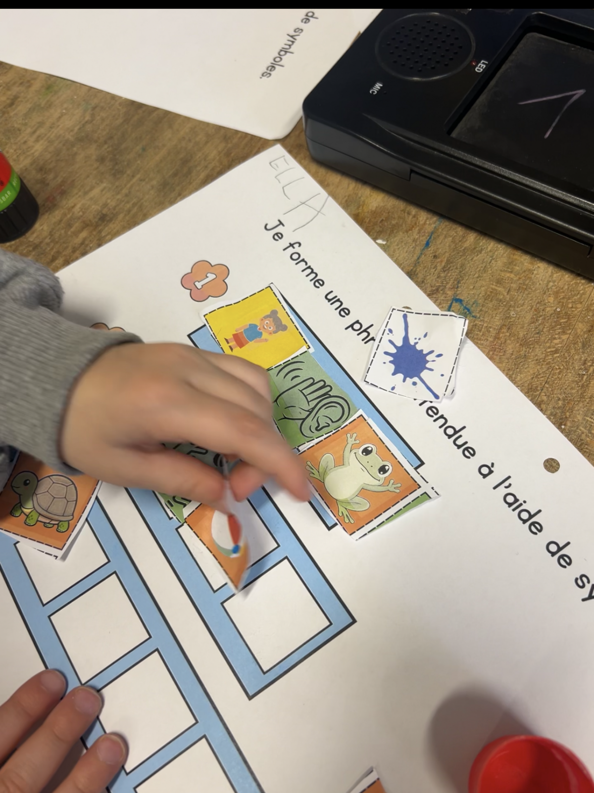 Dans la dernière étape, l’enfant écoute la phrase puis colle les symboles afin de la reconstruire correctement. Cette phase permet de garder une trace et de renforcer la mémorisation de l’ordre des mots.