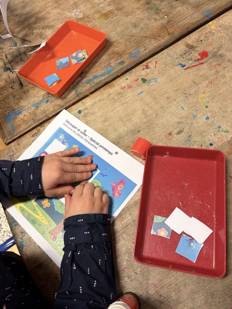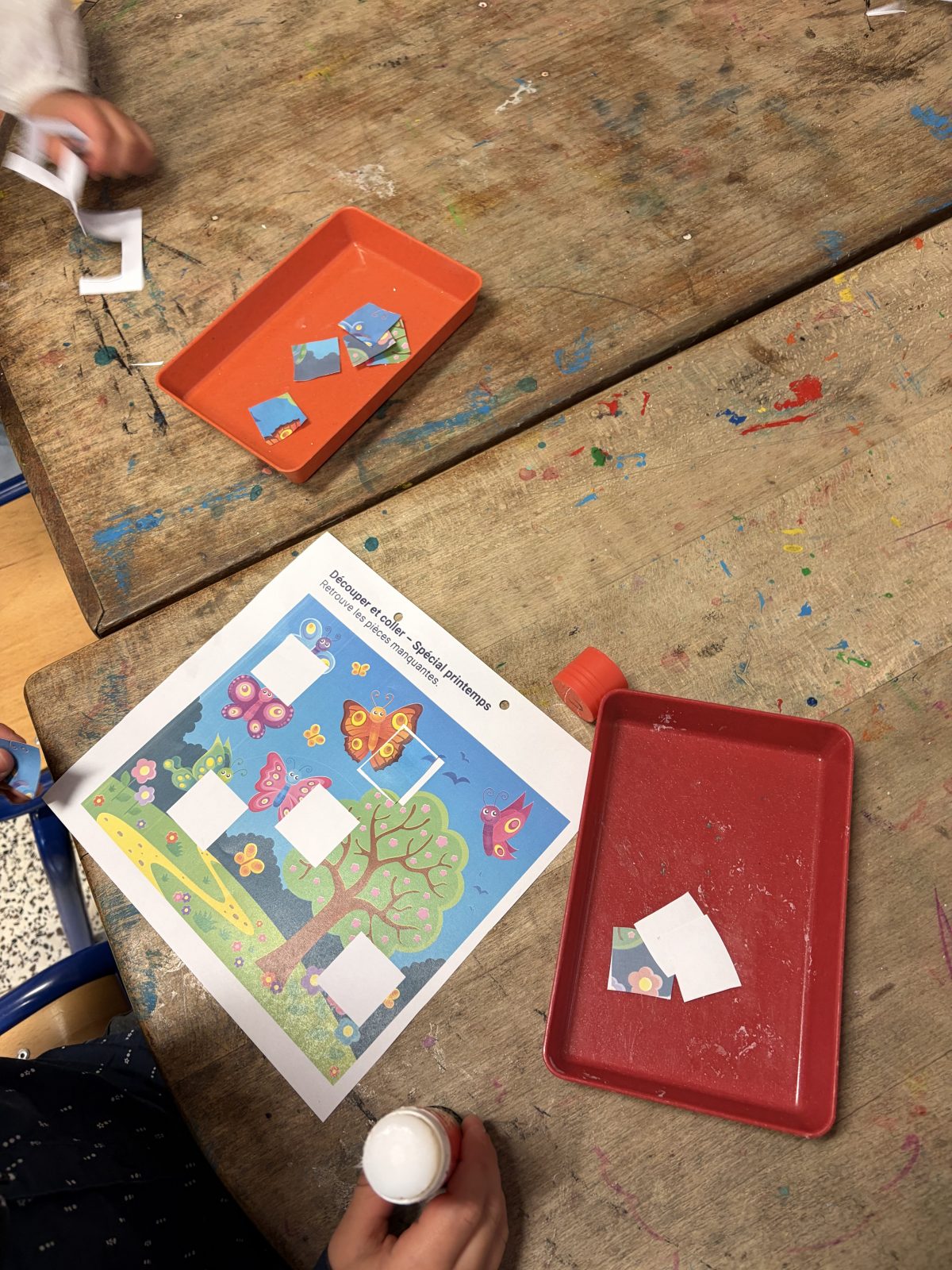 Chaque enfant reçoit une feuille représentant un décor printanier avec plusieurs espaces vides. Les morceaux de l’image sont placés à part. Les enfants doivent :